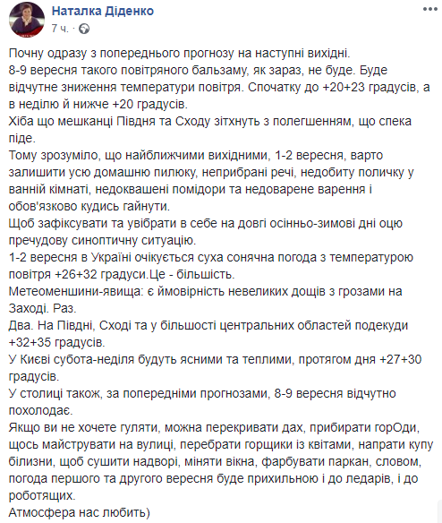 Диденко советует не тратить отличное начало осени на уборку дома, а вырваться куда-то на природу, тем более, что погода во всех без исключения областях Украины будет этому только способствовать.