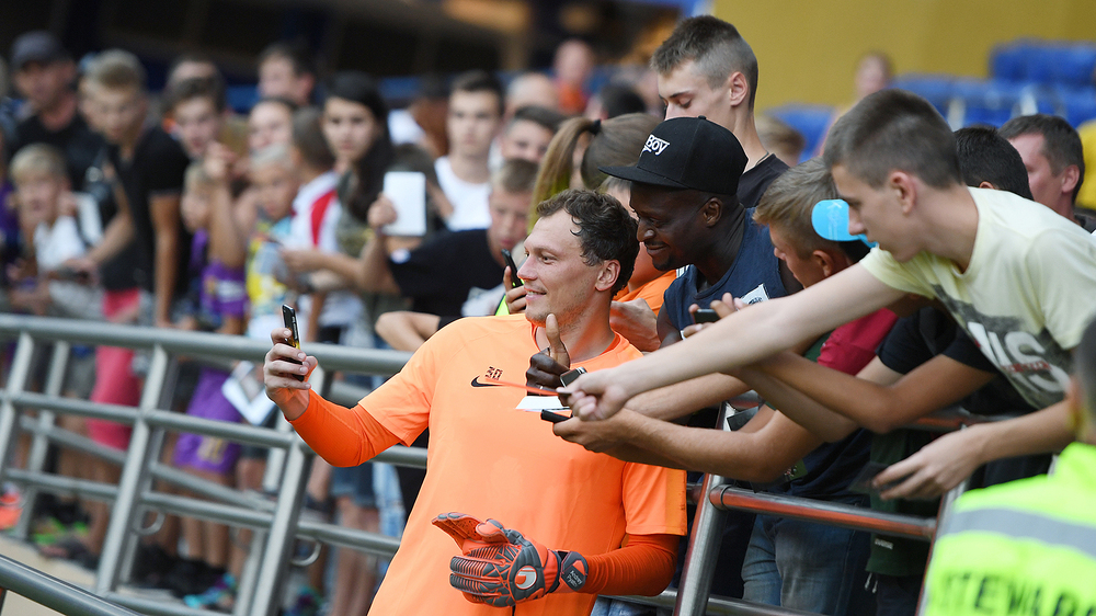 После тренировки перед очередным домашним матчем, футболисты вместе с тренерами устроили фотосессию с фанатами на трибунах.