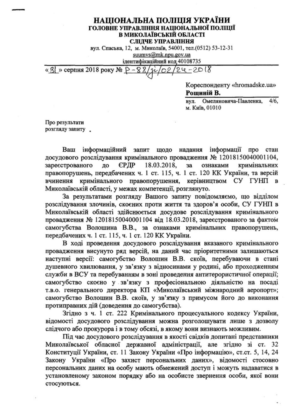 Напомним, глава полиции Николаевской области покинул пост во время расследования суицида Волошина.