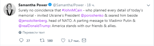 В частности, она написала, что так как Джон Маккейн обдумывал каждую деталь церемонии, он не случайно поставил украинского президента Петра Порошенко рядом с главой НАТО Йенсом Столтенбергом. "Прощальное послание Владимиру Путину и Дональду Трампу: Америка остается вместе с нашими друзьями и союзниками", - отметила Пауэр.
