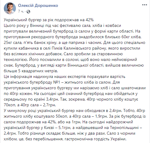 Он сообщил, что стоимость "бургера", как его называет Дорошенко, решили пересчитать после прошедшего фестиваля сала в Виннице.