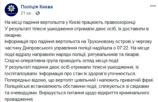 "На месте падения вертолета в Киеве работают правоохранители. В результате падения телесные повреждения получили два человека, их доставили в больницу. Информация о падении вертолета на Трухановом острове поступила в дежурную часть Днепровского управления полиции в 07:22. На место происшествия сразу направили наряды полиции, спасателей и врачей.