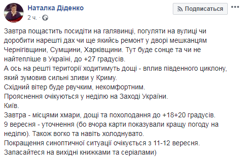"Завтра повезет посидеть на полянке, погулять на улице или доработать наконец крышу или еще какой ремонт во дворе жителям Черниговской, Сумской, Харьковской области", - написала она.