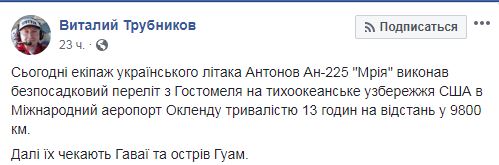 "Экипаж украинского самолета Антонов Ан-225 "Мрия" выполнил непрерывный перелет из Гостомеля на тихоокеанское побережье США в Международный аэропорт Окленда продолжительностью 13 часов на расстояние 9 800 км. Затем самолет отправится на Гаваи и остров Гуам", - написал Трубников.