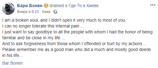 На странице Бари Бонен (Bar Bonen) в 6 утра осталось такое сообщение: "У меня сломанная душа, и я не открыл ее слишком сильно для большинства из вас. Я больше не могу терпеть эту внутреннюю боль...