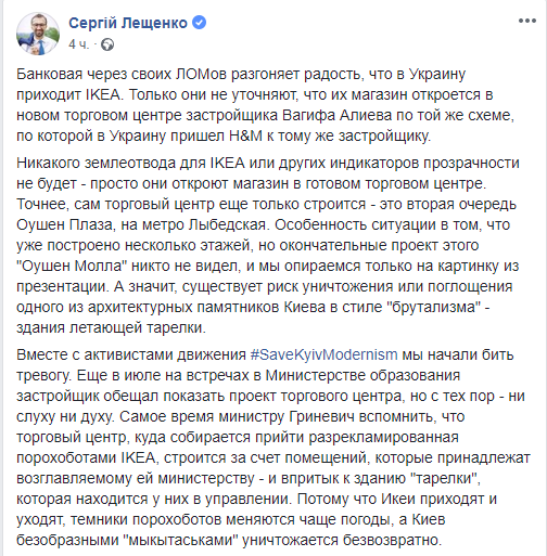 "Банковая через своих ЛОМов разгоняет радость, что в Украину приходит IKEA. Только они не уточняют, что их магазин откроется в новом торговом центре застройщика Вагифа Алиева по той же схеме, по которой в Украину пришел H&M к тому же застройщику.