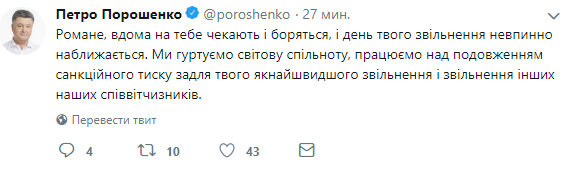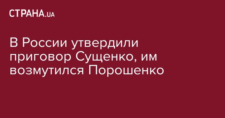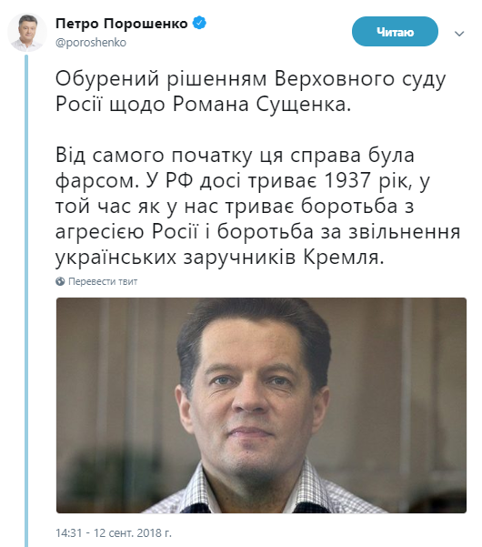 "Возмущен решением Верховного суда России по Романа Сущенко. Изначально это дело было фарсом. В РФ до сих пор продолжается 1937 год, в то время как у нас идет борьба с агрессией России и борьба за освобождение украинских заложников Кремля", - отмечает Порошенко.