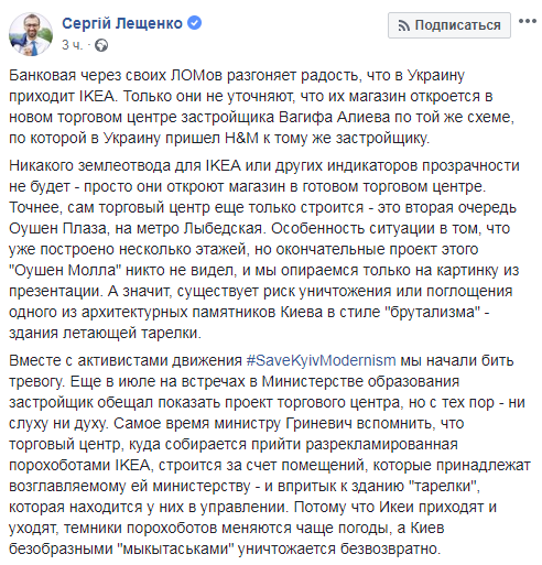 Лещенко заявил,  что "существует риск уничтожения или поглощения одного из архитектурных памятников Киева в стиле "брутализма" – здания летающей тарелки".