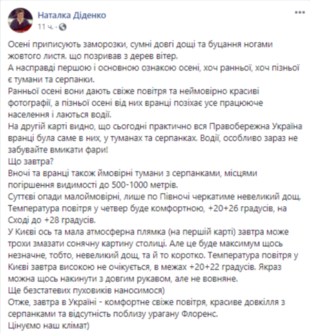"Итак, завтра в Украине - комфортный свежий воздух, красивая окружающая среда с дымкой и отсутствие вблизи урагана Флоренс. Ценим наш климат", - написала Диденко.