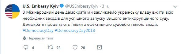 "В Международный день демократии мы призываем украинские власти принять все необходимые меры для успешного запуска Высшего антикоррупционного суда. Демократии процветают только с эффективной судебной ветвью власти", - отметили в посольстве США.