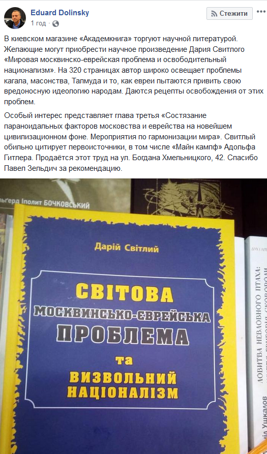 "В киевском магазине "Академкнига" торгуют научной литературой. Желающие могут приобрести научное произведение Дария Свитлого "Мировая москвинско-еврейская проблема и освободительный национализм". На 320 страницах автор широко освещает проблемы кагала, масонства, Талмуда и то, как евреи пытаются привить свою вредоносную идеологию народам. Даются рецепты освобождения от этих проблем.
