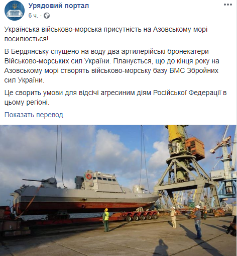 Кроме того, сегодня, 16 сентября, в Бердянске были спущены на воду два артиллерийских бронекатера ВМС Украины.