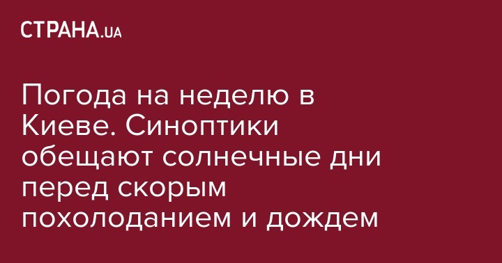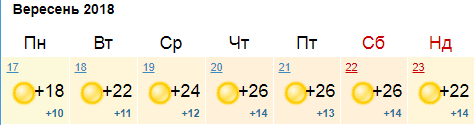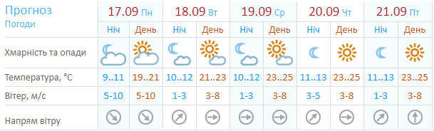 Ресурс Мeteoprog.ua также обещает солнечную неделю в столице к выходным постепенно воздух разогреется до +26, а в воскресенье, 23 сентября, похолодает до +17.