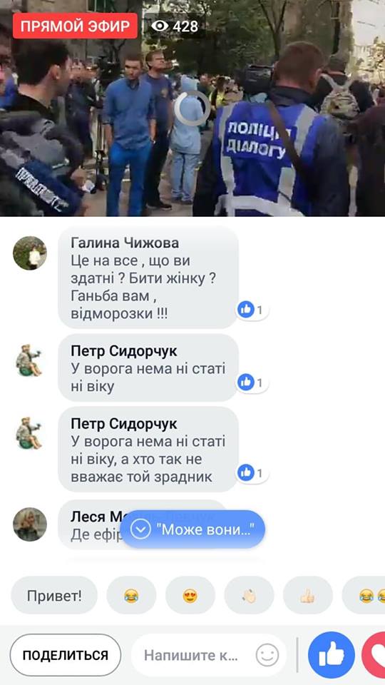 В комментариях под прямой трансляцией событий под зданием Генеральной прокуратуры факт нападения на журналистку вызвал резонанс. Часть комментаторов возмутились тем, что националисты подняли руку на женщину, а часть ответили им тем, что у врага нет ни пола, ни возраста.