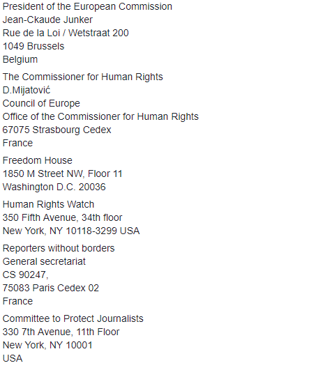В списке значатся порядка 17 организаций, которые получат обращение о вмешательстве в журналистскую деятельность. Среди них президент Европейского Совета Дональд Туск, депатат ПАСЕ от Швейцарии Лилиан Маури Паскер, генсекретарь Совета Европы Турбьёрн Ягланд, Верховный представитель Европейского союза по иностранным делам и политике безопасности в Комиссии Юнкера Федерика Могерини, а также Репортеры без границ, комитет по защите прав журналистов и прочие инстанции.
