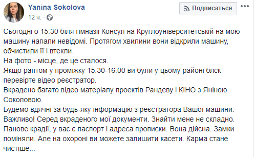 По словам Соколовой, грабители в течение минуты "открыли машину, обчистили ее и скрылись". "Украдено много видео материала проектов "Рандеву" и "КИНО с Яниной Соколовой". Также среди украденного - мои документы, в частности паспорт", - отметила Сокололова.