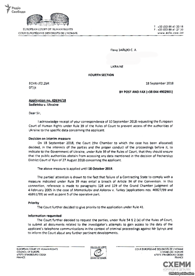 Ранее Апелляционный суд Киева частично удовлетворил жалобу журналистки Натальи Седлецкой на постановление Печерского суда, согласно которому Генпрокуратуре было предоставлено разрешение получить данные с ее телефона за 1,5 года.