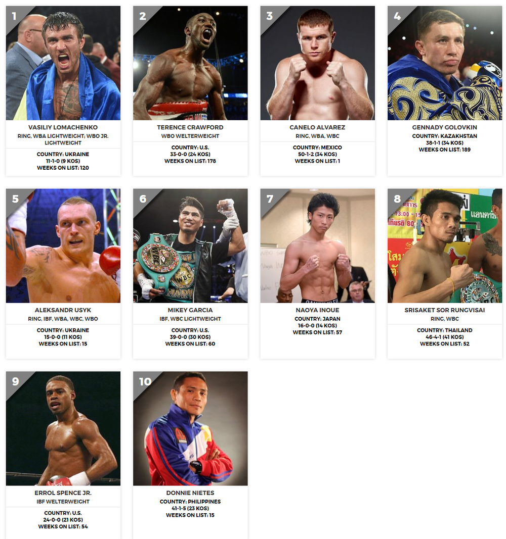 Другой украинец абсолютный чемпион мира Александр Усик потерял одно место и опустился на 5-ю ступень. Сразу за Ломаченко в списке разместился его партнер по промоутерской компании "Top Rank" Теренс Кроуфорд.