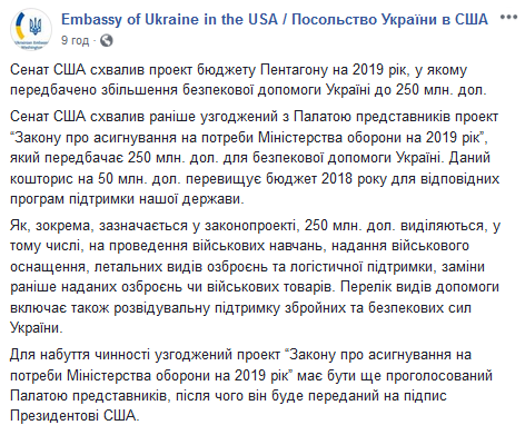 "Сенаторы одобрили ранее согласованный с Палатой представителей проект "Закона об ассигнованиях на нужды Министерства обороны на 2019 год", который предусматривает выделение $250 миллионов для помощи Украине. Данная смету на $50 миллионов превышает бюджет 2018 для соответствующих программ поддержки нашего государства", - заявили в посольстве Украины в США.