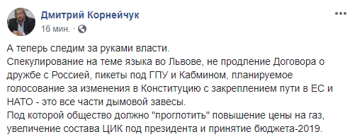 Он же пишет о том, чем могут быть вызваны подобные решения: "А теперь следим за руками власти. Спекулирование на теме языка во Львове, не продление Договора о дружбе с Россией, пикеты под ГПУ и Кабмином, планируемое голосование за изменения в Конституцию с закреплением пути в ЕС и НАТО - это все части дымовой завесы.
