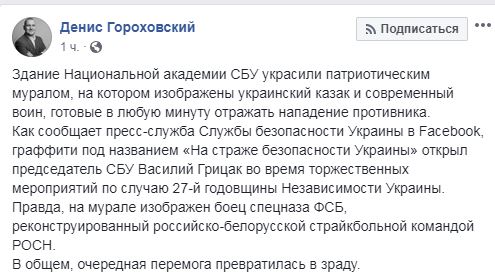 "Как сообщает пресс-служба Службы безопасности Украины в Facebook, граффити под названием "На страже безопасности Украины" открыл председатель СБУ Василий Грицак во время торжественных мероприятий по случаю 27-й годовщины Независимости Украины. Правда, на мурале изображен боец спецназа ФСБ, реконструированный российско-белорусской страйкбольной командой РОСН",  - сообщает Гороховский. И резюмирует: "В общем, очередная "перемога" превратилась в "зраду". Гороховский также приводит фото мурала и изображение бойца ФСБ.