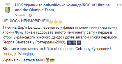 17-летняя украинская дзюдоистка, чемпион Европы Дарья Билодид теперь завоевала титул чемпионки мира. Об этом сообщает в соцсети пресс-служба Национального олимпийского комитета Украины.