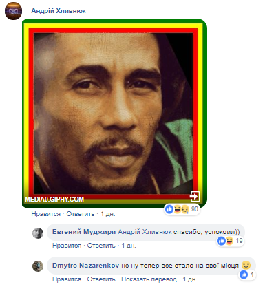 Этот же пост опубликовал у себя в Facebook основатель украинского портала для автомобилистов Autogeek Евгений Муджири. В комментариях под ним отметился лидер "Бумбокса" Андрей Хлывнюк, который запостил фотографию музыканта Боба Марли, растамана, не скрывавшего любовь к марихуане.