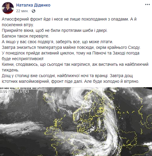 По прогнозам Натальи Диденко, в понедельник, 24 сентября, в Киеве "отметится" циклон, который принесет крайне не комфортную погоду: дожди, сильный ветер и невысокую температуру.