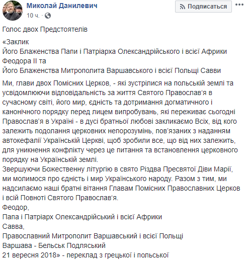 "Мы, главы двух поместных церквей, которые встретились на польской земле, осознавая ответственность за жизнь Святого Православия в современном мире, его покой, единство и соблюдение догматического и канонического порядка, перед лицом испытаний, которые переживает сегодня православие в Украине, в духе братской любви призываем всех, от кого зависит преодоление церковных недоразумений, связанных с предоставлением автокефалии Украинской Церкви, сделать все от них зависящее, дабы избежать конфликта из-за этого вопроса и установить мир на Украинской земле.