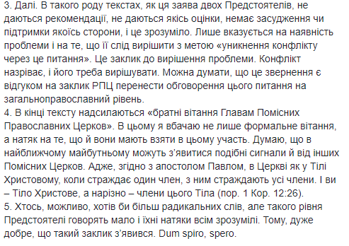 Комментируя данное обращение у себя на личной странице в Facebook, заместитель главы Отдела внешних церковных связей УПЦ протоиерей Николай Данилевич отметил, что обеспокоенность предстоятелей двух Поместных Церквей, "как украинским церковным вопросом, так и судьбой всего православия, единство которого - под угрозой", свидетельствует о том, что этот вопрос "не касается теперь уже только исключительно Москвы, Константинополя и Киева".
