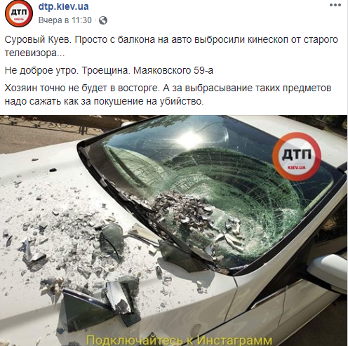 В субботу, 22 сентября, в Киеве на улице Маяковского, 59-а, с балкона сбросили кинескоп от старого телевизора. Тяжелый предмет рухнул на стоящий внизу автомобиль, разбив лобовое стекло и капот. Об этом сообщает dtp.kiev.ua на своей странице в Facebook.