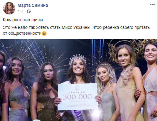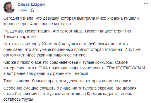 "Сегодня узнала, что девушку, которая выиграла Мисс Украина лишили короны через 4 дня после конкурса. Ну, думаю, может нашли, что эскортница.. может танцует стриптиз. Толкает наркоту? Нет, оказывается, у 23-летней девушки есть ребенок 4х лет. А мы понимаем, что это уже испорченный продукт, старая говядина. И тут же оргкомитет Мисс Украина лишил ее титула.