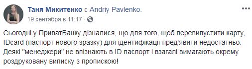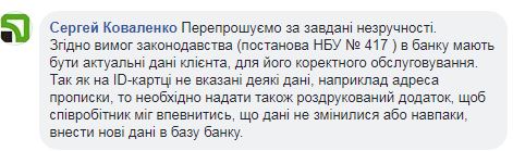 В комментариях, кстати, представители банка ей отвечают, что согласно требований законодательства (постановление НБУ № 417 ) в банке должны быть актуальные данные клиента, для его корректного обслуживания.