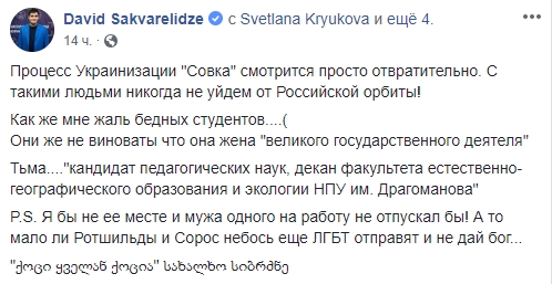 Так, политик Давид Сакварелидзе пишет: " Процесс украинизации "Совка" смотрится просто отвратительно. С такими людьми никогда не уйдем от Российской орбиты! Как же мне жаль бедных студентов... Они же не виноваты, что она жена "великого государственного деятеля".