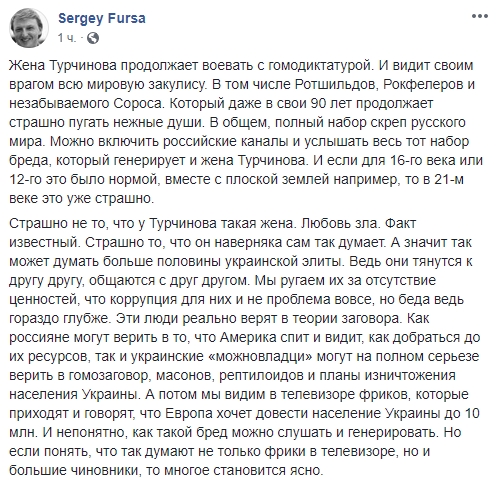 "Жена Турчинова продолжает воевать с гомодиктатурой. И видит своим врагом всю мировую закулису. В том числе Ротшильдов, Рокфелеров и незабываемого Сороса. Который даже в свои 90 лет продолжает страшно пугать нежные души. В общем, полный набор скреп русского мира. Можно включить российские каналы и услышать весь тот набор бреда, который генерирует и жена Турчинова. И если для 16-го века или 12-го это было нормой, вместе с плоской землей, например, то в 21-м веке это уже страшно".