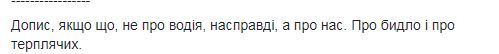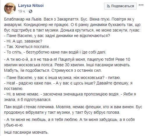"Блаблакар на Львов. Вася из Закарпатья. Бус. Окна глухие. Воздух, как в аквариуме. Кондиционер не работает. В 6 утра динамики бухкают так, что бус подпрыгивает в такт музыке. Дочь крутится, не может заснуть, кричит: "Василий, у вас задние динамики не отключаются? Хочется поспать". "Нет, а что, мешает? Так спите", — беззаботно говорит водитель и едет дальше. "А ты мо-о-й, а я нэ тва-а-я! Пацелуй меня, пацелую тебя!" Ревет 10 минут московская попса. Ревет 30 минут. Другие пассажиры молчат. Видимо, им нравится. Сдерживаюсь из последних сил", - возмущается писательница.