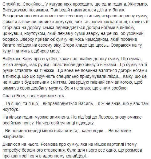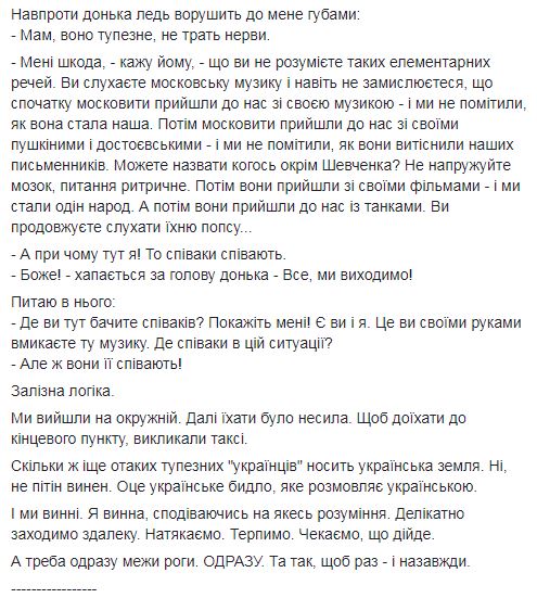 "Мне жаль, - говорю ему, - что вы не понимаете таких элементарных вещей. Вы слушаете московскую музыку и даже не задумываетесь, что сначала московиты пришли к нам со своей музыкой - и мы не заметили, как она стала наша. Затем московиты пришли к нам со своими Пушкиным и Достоевским - и мы не заметили, как они вытеснили наших писателей. Можете назвать кого-то кроме Шевченко? Не напрягает мозг, вопрос риторический. Затем они пришли со своими фильмами - и мы стали "один народ". А потом они пришли к нам с танками. Вы продолжаете слушать их попсу", - обратилась писательница к водителю.