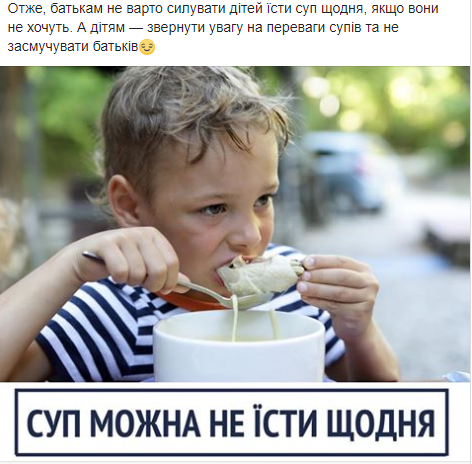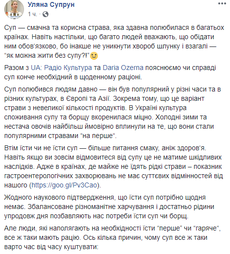 Исполняющая обязанности министра здравоохранения Ульяна Супрун заявила, что отказ от супа не является вредным для здоровья, потому что в странах без жидких блюд показатель гастроэнтерологических заболеваний не имеет существенных отличий от Украины. Об этом она сообщила на своей странице в Facebook.