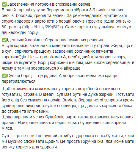 "Никакого научного подтверждения, что есть суп нужно каждый день нет. Сбалансированное разнообразное питание и достаточно жидкости в течение дня лишают нас потребности есть суп или борщ", - написала Супрун.