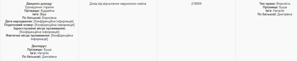 Зато есть другое упоминание - месяц назад Наталья Буша указала, что получила прибыль в размере 2,4 миллиона гривен от отчуждения недвижимости иностранному гражданину.