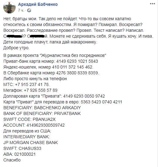 Скриншот: Facebook/ Аркадий Бабченко