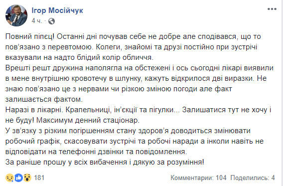 Народный депутат от Радикальной партии Игорь Мосийчук попал в больницу, врачи обнаружили у него внутреннее кровотечение в желудке. Об этом сам политик сообщил на своей странице в Facebook.