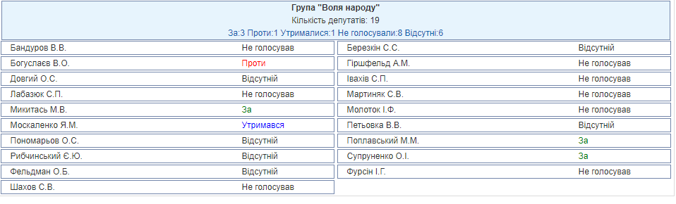 От "Воли народа" на заседании присутствовали 13 человек из 19. Трое из них поддержали введение санкций, против выступил только нардеп Богуслаев, воздержался нардеп Москаленко, а еще 8 парламентариев решили и вовсе не голосовать.