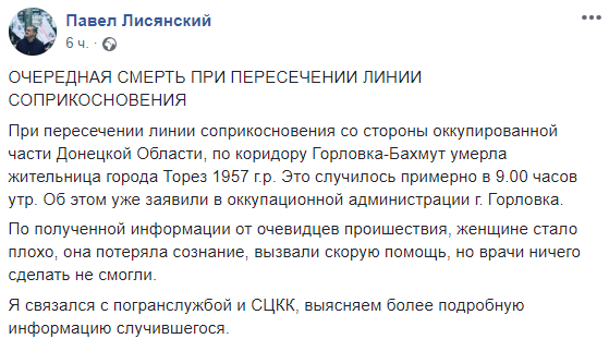 "При пересечении линии соприкосновения со стороны оккупированной части Донецкой Области, по коридору Горловка-Бахмут умерла жительница города Торез 1957 г.р. Это случилось примерно в 9.00 часов утра. Об этом уже заявили в оккупационной администрации г. Горловка.