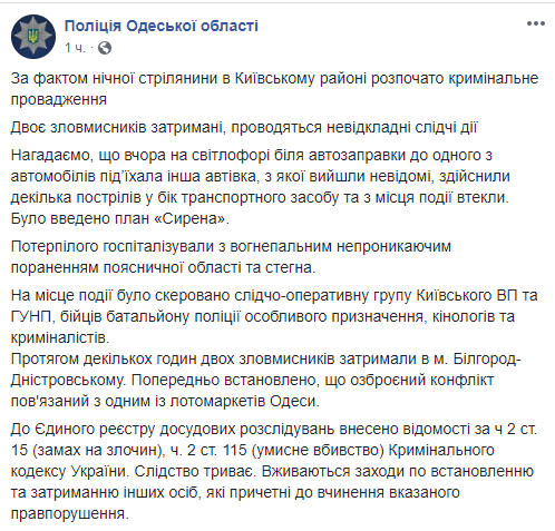 "В течение нескольких часов два злоумышленника были задержаны в г. Белгород-Днестровском. Их доставили в Киевский отдел полиции Одессы. Предварительно установлено, что вооруженный конфликт связан с одним из лотомаркетов, расположенных на территории города", - сказано в сообщении.
