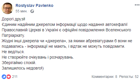 В свою очередь директор Национального института стратегических исследований при президенте Украины, советник президента Украины Ростислав Павленко на своей странице в соцсети Фейсбук отметил: "Единственным надежным источником информации о предоставлении автокефалии Православной Церкви в Украине являются официальные сообщения Вселенского Патриархата. Никакие другие источники или "источники"… информации не имеют, и поэтому не могут сообщить".