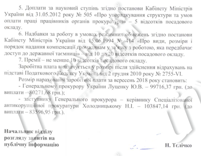 Оклад прокурора составил 63 432 грн. Зарплата указана с учетом надбавок, доплат и премий. После удержания налогов и сборов Холодницкий получил 83 596 грн.