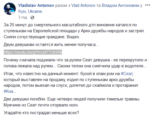 Первоначальная информация о том, что за рулем Seat Leon была девушка не подтвердилась. Как выяснилось, за 25 минут до смертельного ДТП его виновник, ром по национальности, катался по ступенькам на Европейской площади у Арки Дружбы народов.