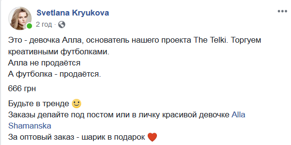 "Это - девочка Алла, основатель нашего проекта The Telki. Торгуем креативными футболками. Алла не продаётся. А футболка - продаётся. 666 грн. Будьте в тренде. Заказы делайте под постом или в личку красивой девочке Alla Shamanska. За оптовый заказ - шарик в подарок", - написала Светлана Крюкова.