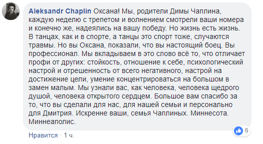 В комментариях Марченко похвалили и родители Чаплина, которые надеялись на победу. Они отметили, что танцах, как и в спорте, случаются травмы. Также родители отметили некоторые качества Оксаны Марченко, которые говорят о ней, как о настоящем борце: стойкость, отношение к себе, психологический настрой и отрешенность от всего негативного, настрой на достижение цели, умение концентрироваться на большом в замен малому.